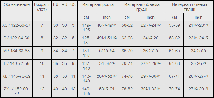 Таблица соответствия размеров детского термобелья
