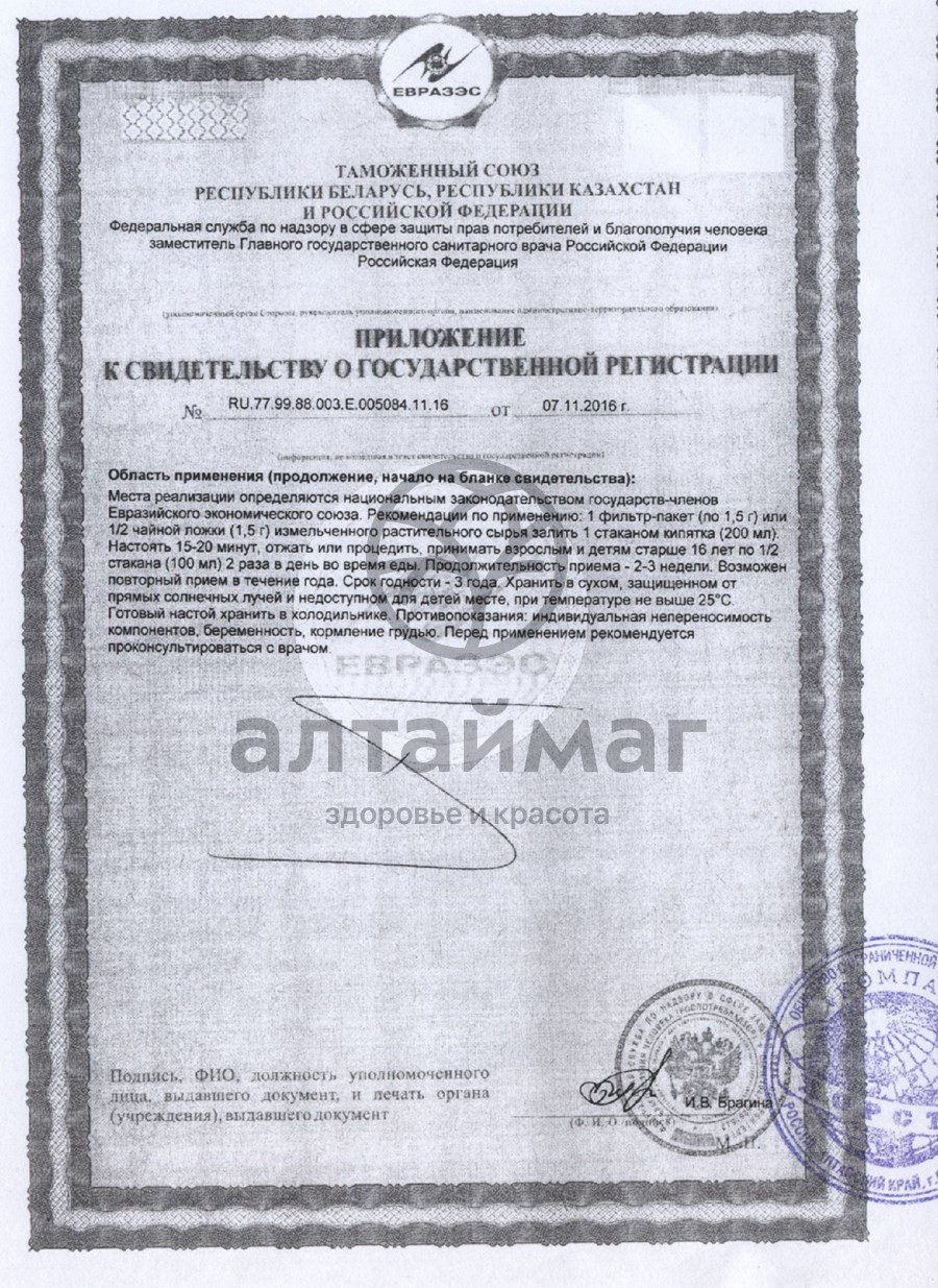 Рекомендуется при хронических и воспалительных заболеваниях дыхательных путей и глотки; при воспалениях слизистых оболочек полости рта и горла, различных желудочно-кишечных заболеваниях и инфекциях; при воспалительных заболеваниях почек, воспалении мочевого пузыря, болезненном и непроизвольном мочеиспускании, белях, камнях в почках, аденоме простаты, хроническом простатите; при экземе, псориазе, нейродермите, дерматите, для нормализации обмена веществ.Масса нетто: