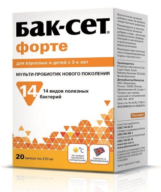 - Удобство - не требует хранения в холодильнике; капсулу можно глотать целиком или вскрывать и разводить ее содержимое в воде, молоке или соке. Большинство пробиотических препаратов необходимо хранить в холодильнике, так как при комнатной температуре живые микробы погибают или утрачивают свою активность. Это не всегда удобно, так как пробиотики невозможно взять с собой в дорогу. Бак-Сет форте производится по специальной технологии, позволяющей сохранять жизнеспособность и активность пробиотических бактерий даже при комнатной температуре и в течение всего срока годности препарата. Капсулу можно поглатывать целиком, при желании можно вскрыть и развести ее содержимое в воде, соке, кефире.